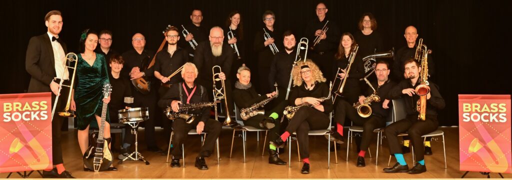 Die Brasssocks sind eine aus Klingenthal stammende Bigband. 2019 wurde sie mit dem Wunsch gegründet, mit schwungvoller und stimmungsvoller Musik im tollen Bigband-Sound die Leute zu unterhalten. Bekannte Melodien aus der Musik-Geschichte, mitreißender Swing und Blues, sowie lateinamerikanische Rhythmen prägen das Repertoire dieser aus einer guten Mischung von jungen und älteren Musikern bestehenden Truppe. Zur Bigband gehören 6 Saxophone, 5 Posaunen, 4 Trompeten, Horn, Piano, Rhythmusgruppe und Sängerin. Geleitet wird die Bigband von Niklas Liebscher. Unterstützt von ihrem Fanclub sind sie nicht nur im Vogtland eine feste Größe. Mittlerweile ist die Band seit 2024 regelmäßiger Teilnehmer beim Dresdner Dixieland-Festival, so auch in diesem Jahr. Da trifft es sich gut, dass sie nun auch erstmals bei uns auftreten werden.